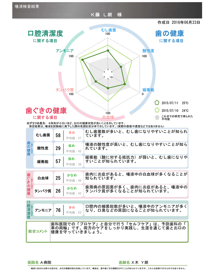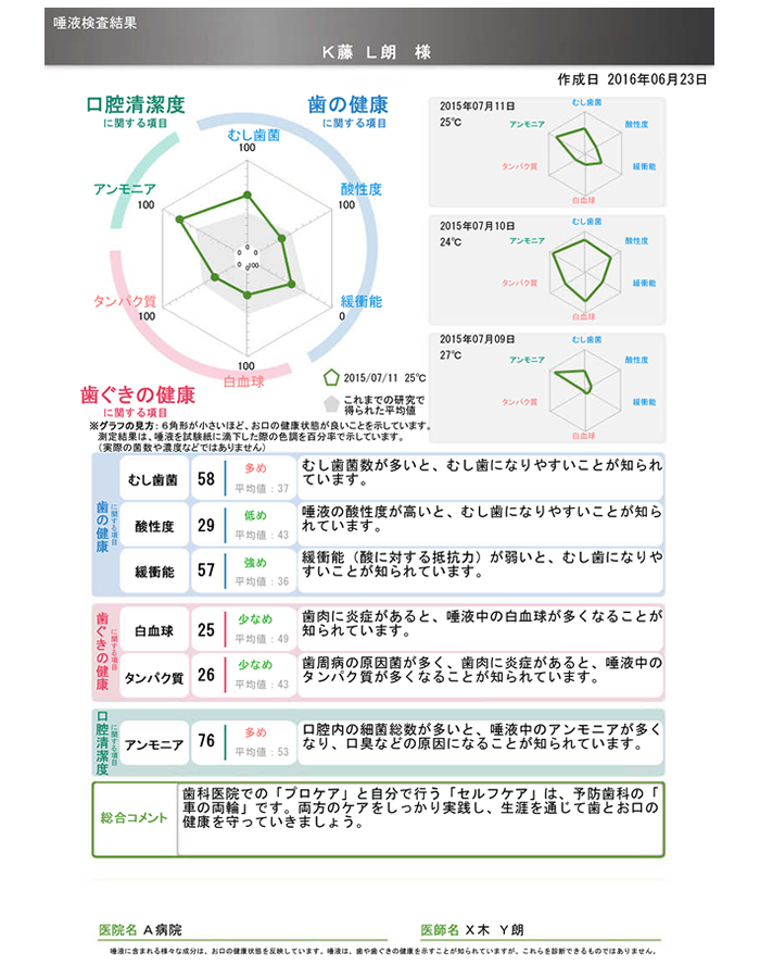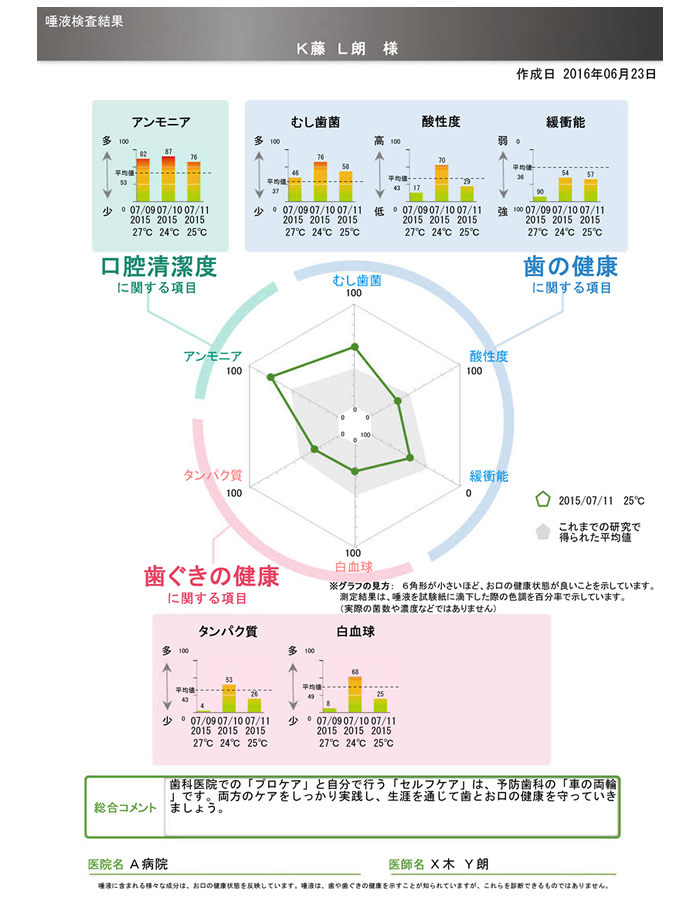 検査結果をレーダーチャートで表示します。 視覚的に分かりやすい報告書で患者さまに結果説明できます。
